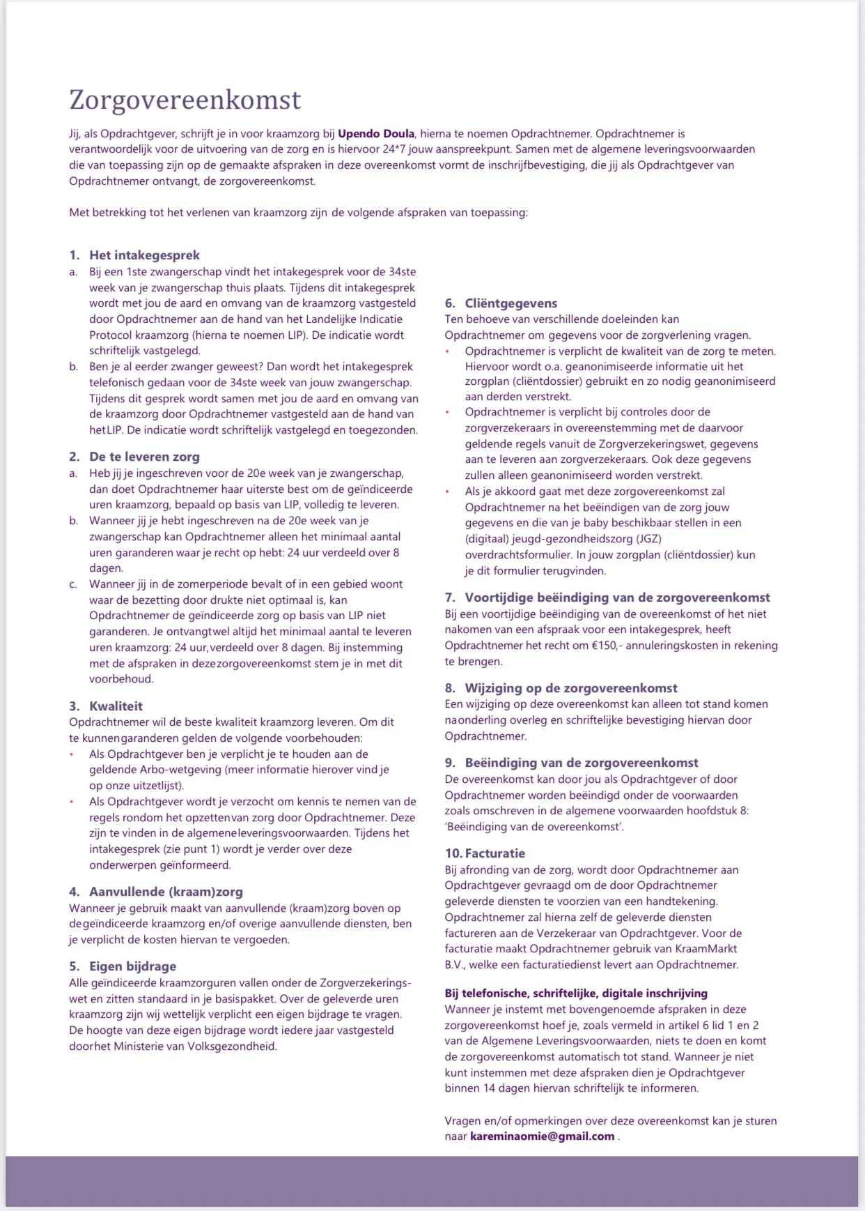 Please know beforehand that when you register for Kraamzorg on the online portal, you agree to my terms and conditions ( Zorgovereenkomst)which are highlighted clearly here also. There are 3 boxes you have to click to proceed with your registration for Kraamzorg online. Ticking those boxes mean you understand the terms and conditions during registration and that you are bind to those conditions. It is therefore your responsibility to make sure you have read the terms and conditions clearly, translate them in your own language if you must, because once your due date is reserved on the system, you are bind by an understanding that you understood ticking those x3 boxes, you are liable to a €150 if you then do not cancel your registration for kraamzorg, 14 days after you subscribed, even if Kraamzorg is not given.